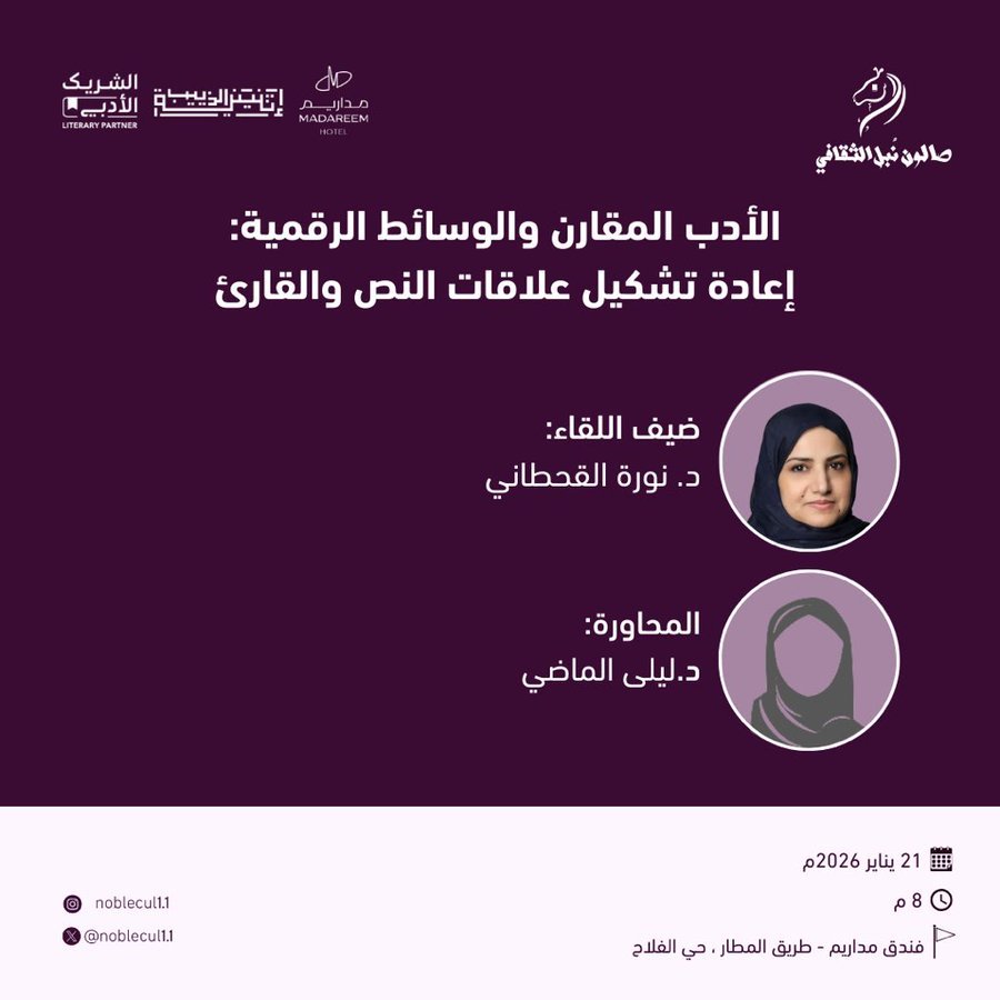 برعاية كريمة من إثنينية الذييب، يُقيم صالون نُبل الثقافي ضمن مبادرة الشريك الأدبي أمسية ثقافية بعنوان: “الأدب المقارن والوسائط الرقمية: إعادة تشكيل علاقات النص والقارئ “، يوم الحادي والعشرين من يناير 2026، الساعة الثامنة مساءً في فندق مداريم.