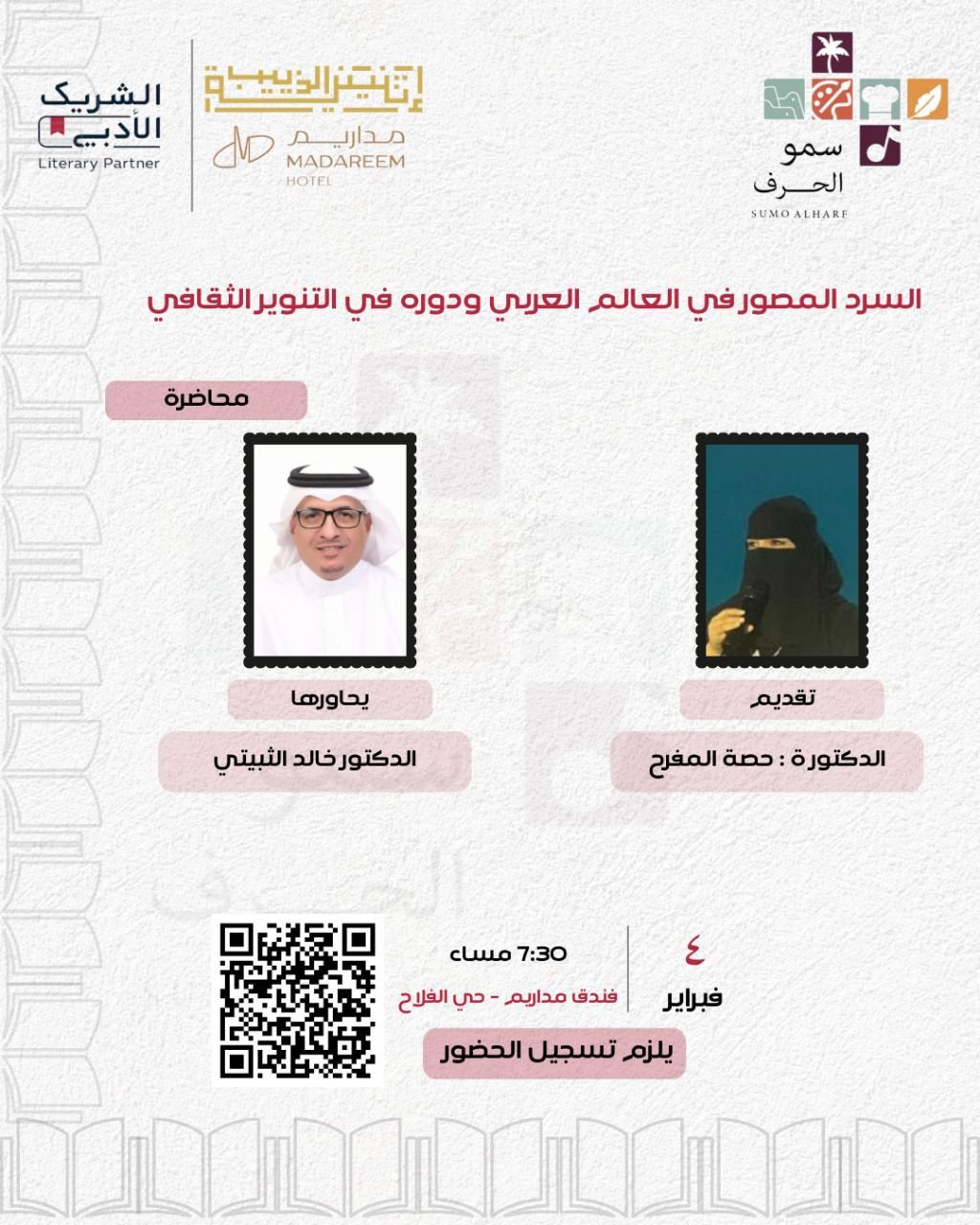 برعاية كريمة من إثنينية الذييب، يُقيم صالون سمو الحرف الثقافي ضمن مبادرة الشريك الأدبي أمسية ثقافية بعنوان: “السرد المصور في العالم العربي ودوره في التنوير الثقافي“، يوم الخامس والعشرين من يناير 2026، الساعة السابعة والنصف مساءً في فندق مداريم.