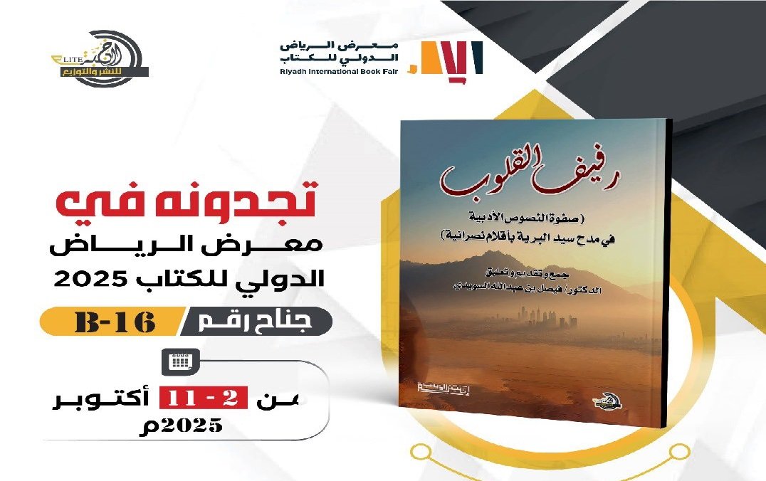 برعاية إثنينية الذييب صدر الكتاب الجديد للدكتور فيصل السويدي“رفيف القلوب: صفوة النصوص الأدبية في مدح سيد البرية بأقلام نصرانية” عن دار النخبة المثقفة للنشر والتوزيع، وبرعاية كريمة من إثنينية الذييب، كما يعرض الكتاب ضمن إصدارات الدار في معرض الرياض الدولي.