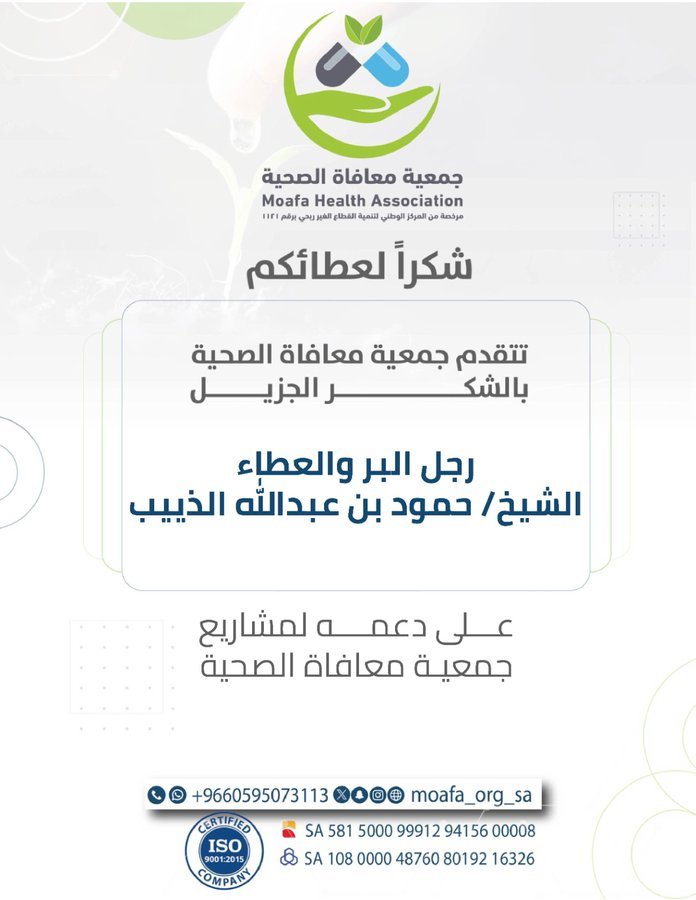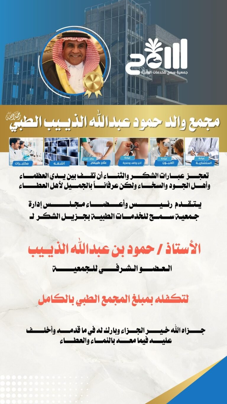 جمعيةسمح للخدمات الطبية تتقدم بجزيل الشكر لـسعادة الأستاذ / حمود بن عبد الله الذييب لتكفله بكامل تكلفة المجمع الطبي
